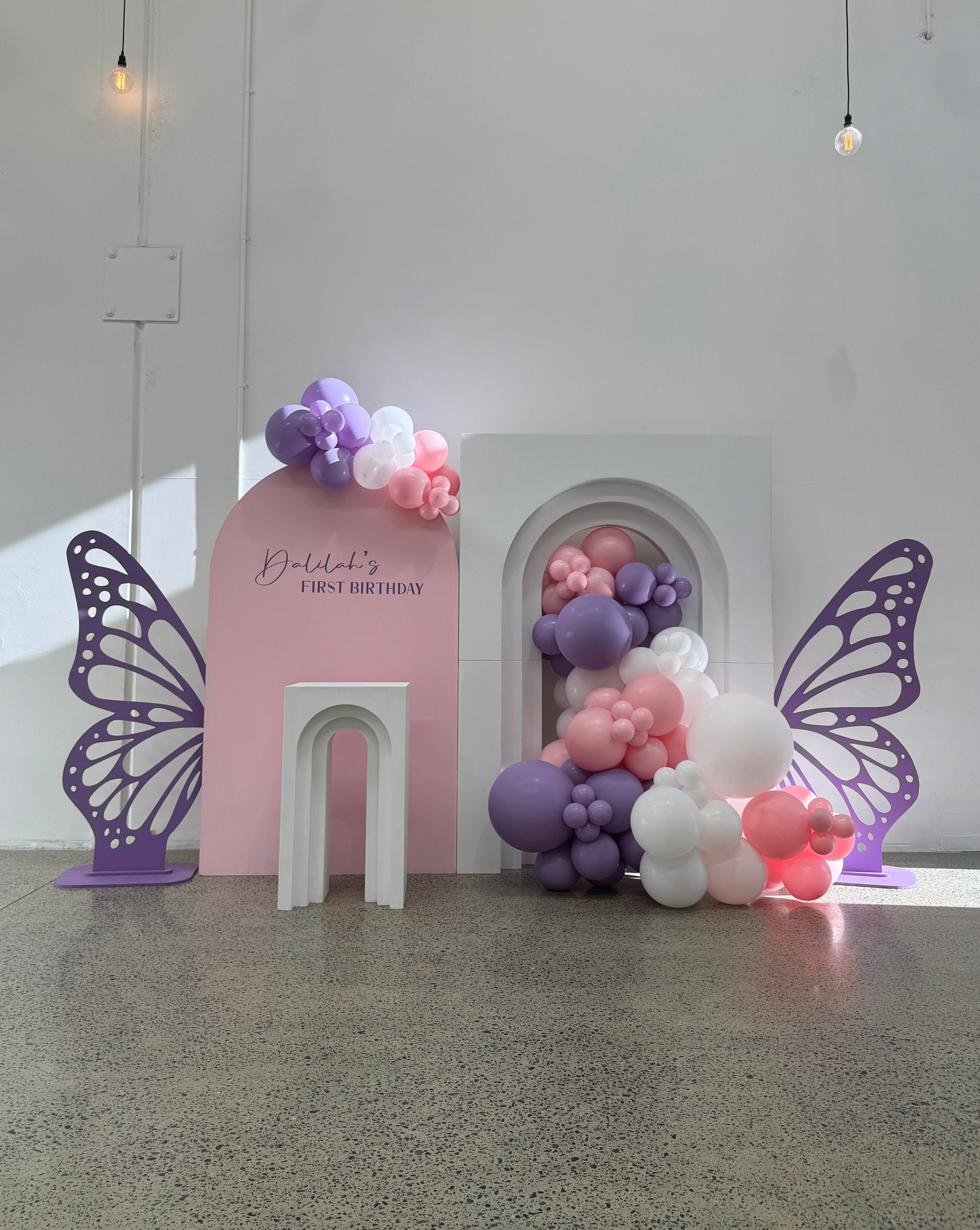 Make your little one’s butterfly dreams come to life with our Dalilah Butterfly Package, a beautifully styled setup that takes the stress out of party planning. With custom colours, elegant backdrops, and a dreamy balloon garland, we make it easy to create a magical celebration!
